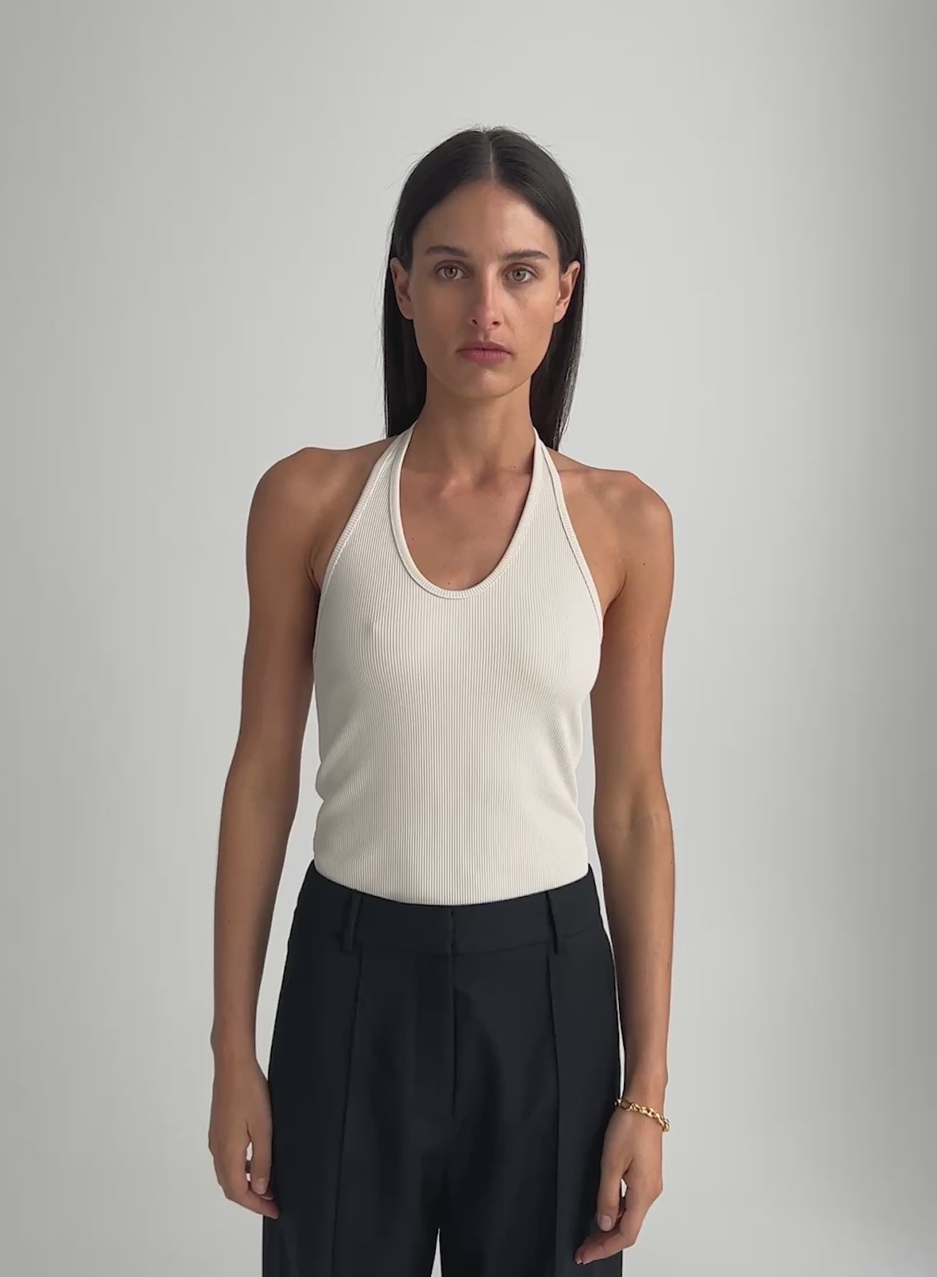 The Allison Top is crafted in a technical stretch rib fabrication, featuring a slim halter neckline and a clean, body-skimming silhouette. The perfect length to be worn tucked in or out, the Allison Top is designed for versatility, offering an elevated foundation for tailored and off-duty dressing.