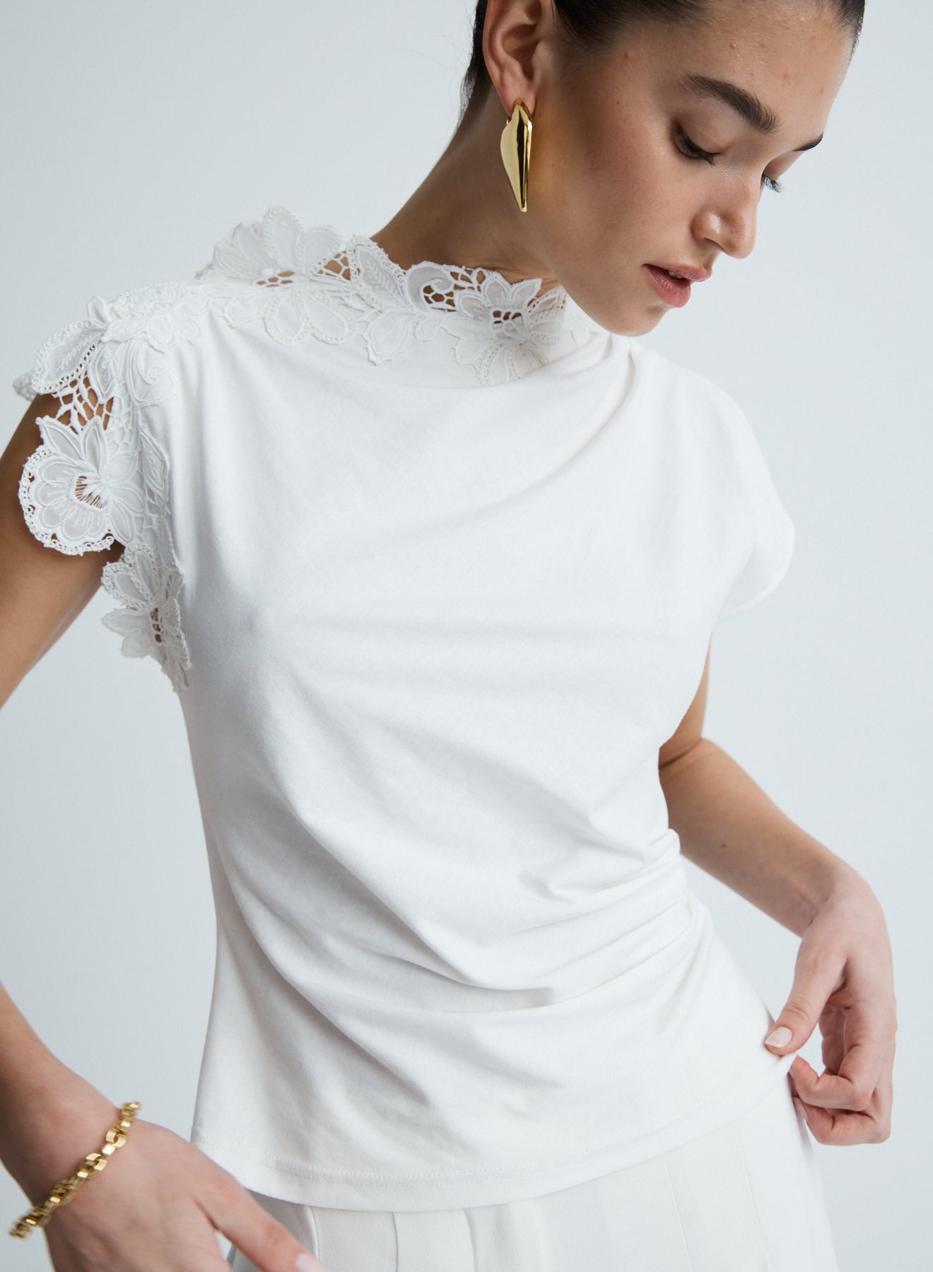 The Nelly T-Shirt in White Jersey is crafted from a soft cotton and detailed with a guipure lace appliqué across the neckline and sleeve. Featuring a subtle side-gather enhances a flattering silhouette.