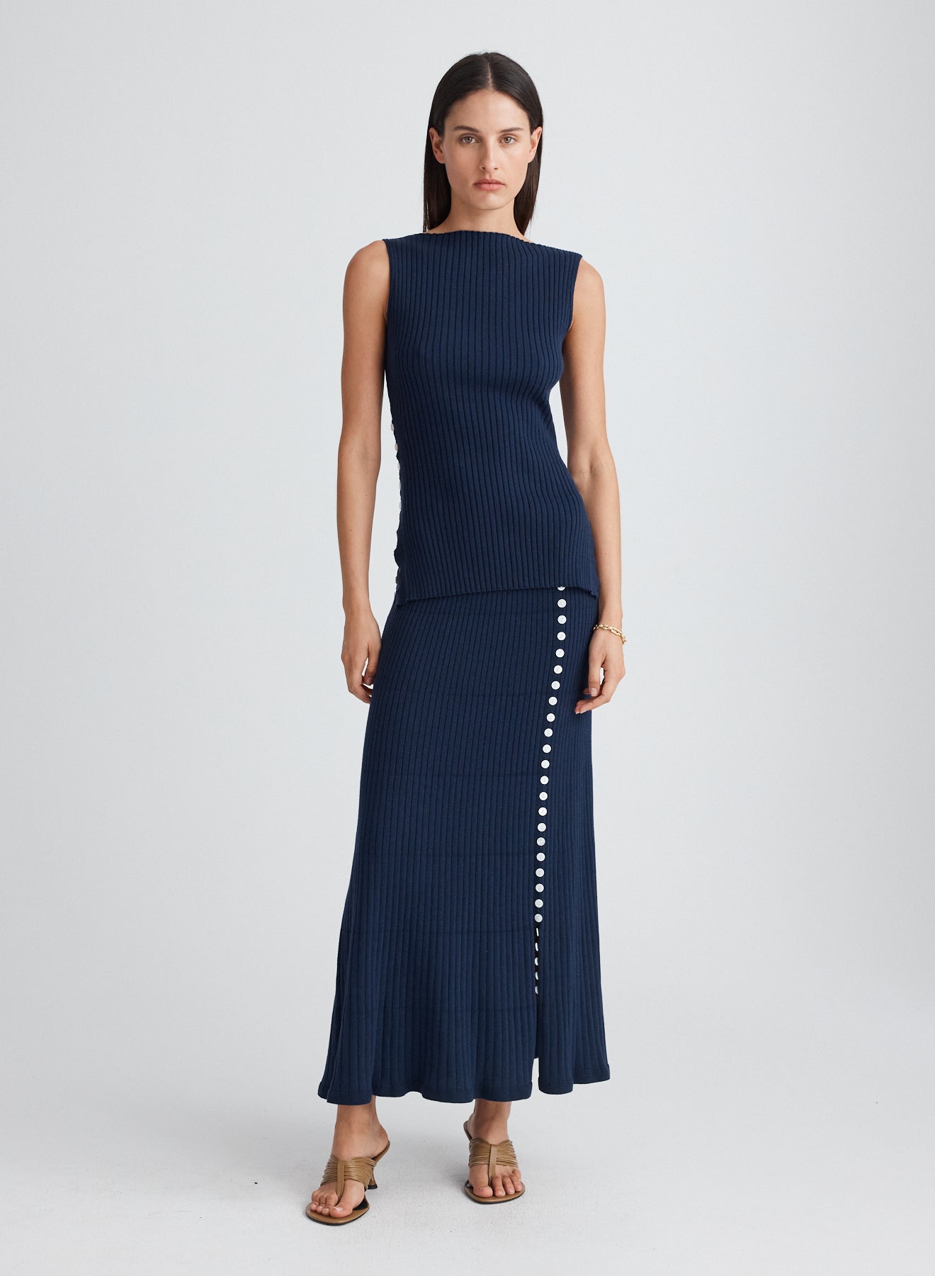 The Rio Top in Sailor is a sleeveless tank designed in a soft 100% cotton knit, featuring a high neckline. Completed with rouleau loop side seams, customisable for the wearer
