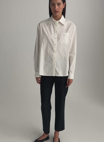 The Brooklyn Shirt in Swan is an iconic AQ piece with a classic take on a signature white shirt. A layering solution that offers endless style experimentation. Grounded in functionality, this oversized shirt is relaxed with a drop shoulder seam, full length sleeves and a minimal patch pocket. Cut in a responsibly sourced stretch cotton selected for it's smooth finish, that feels cool and comfortable against the skin.