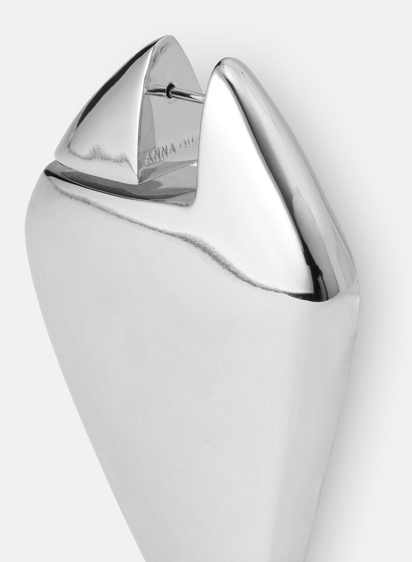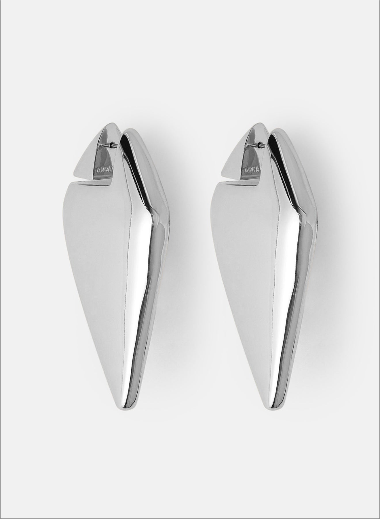The Calder Earrings in Silver feature a curved, angular silhouette. Designed to frame the face with subtle edge, this statement pair lends a refined modernity to any look.