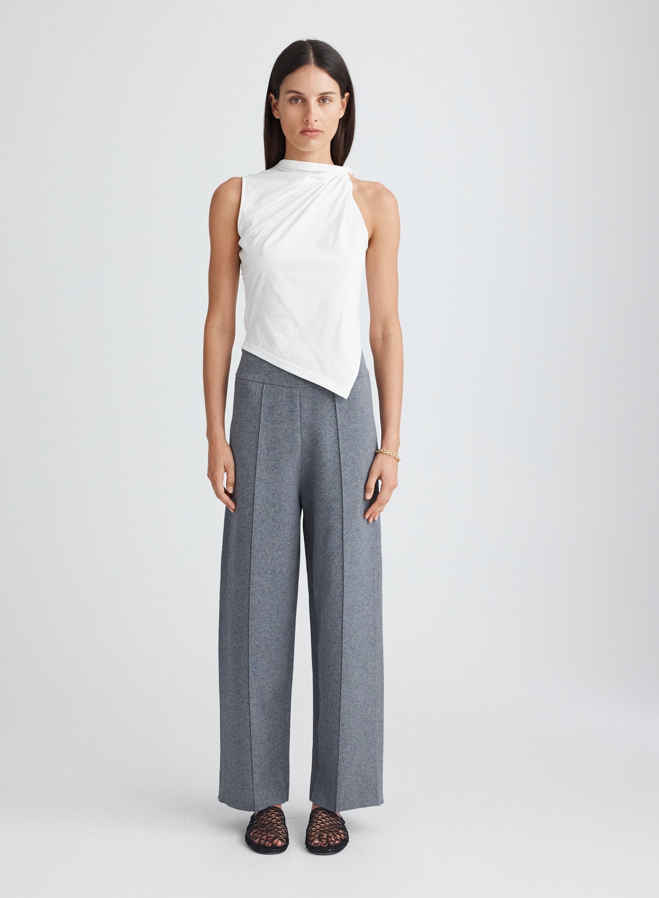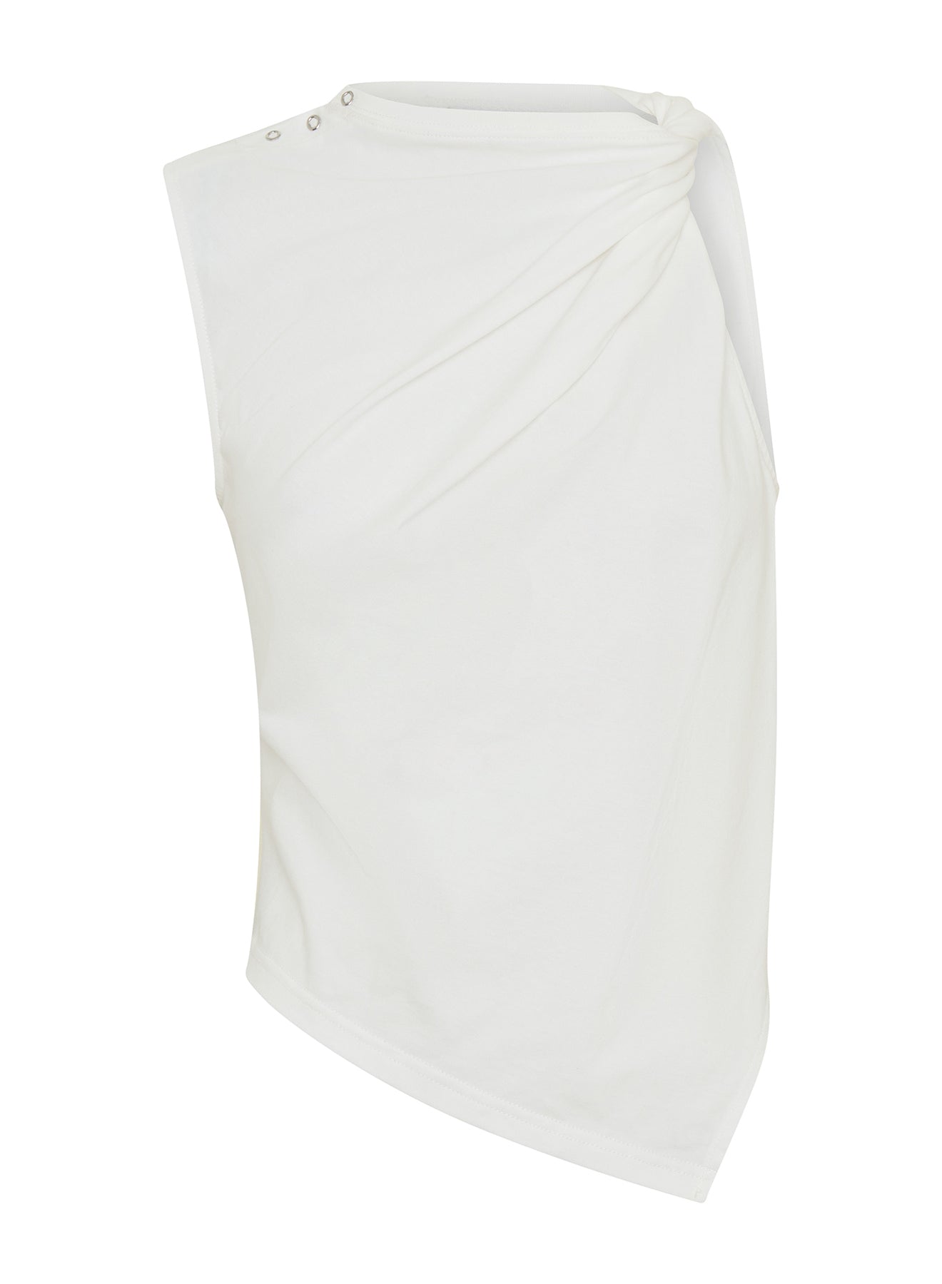 A reimagined wardrobe essential. The Celia Top is a deconstructed tank silhouette crafted from a 100% cotton jersey, defined by an asymmetric shoulder twist at the neckline and a clean, angular hem. Designed to elevate everyday dressing, pair back with light wash jeans or tailored pants.