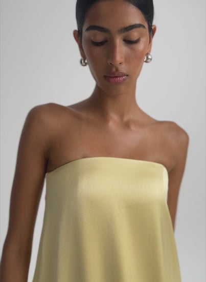 The Delfina Dress in Champagne is a timeless occasion piece to keep in your wardrobe for years to come. Showcasing a feminine strapless silhouette and internal bodice for support and ease of wear. Cut in a soft silky feel fabrication and completed with side pockets. This dress can be styled for summer day time events or more formal evening events.