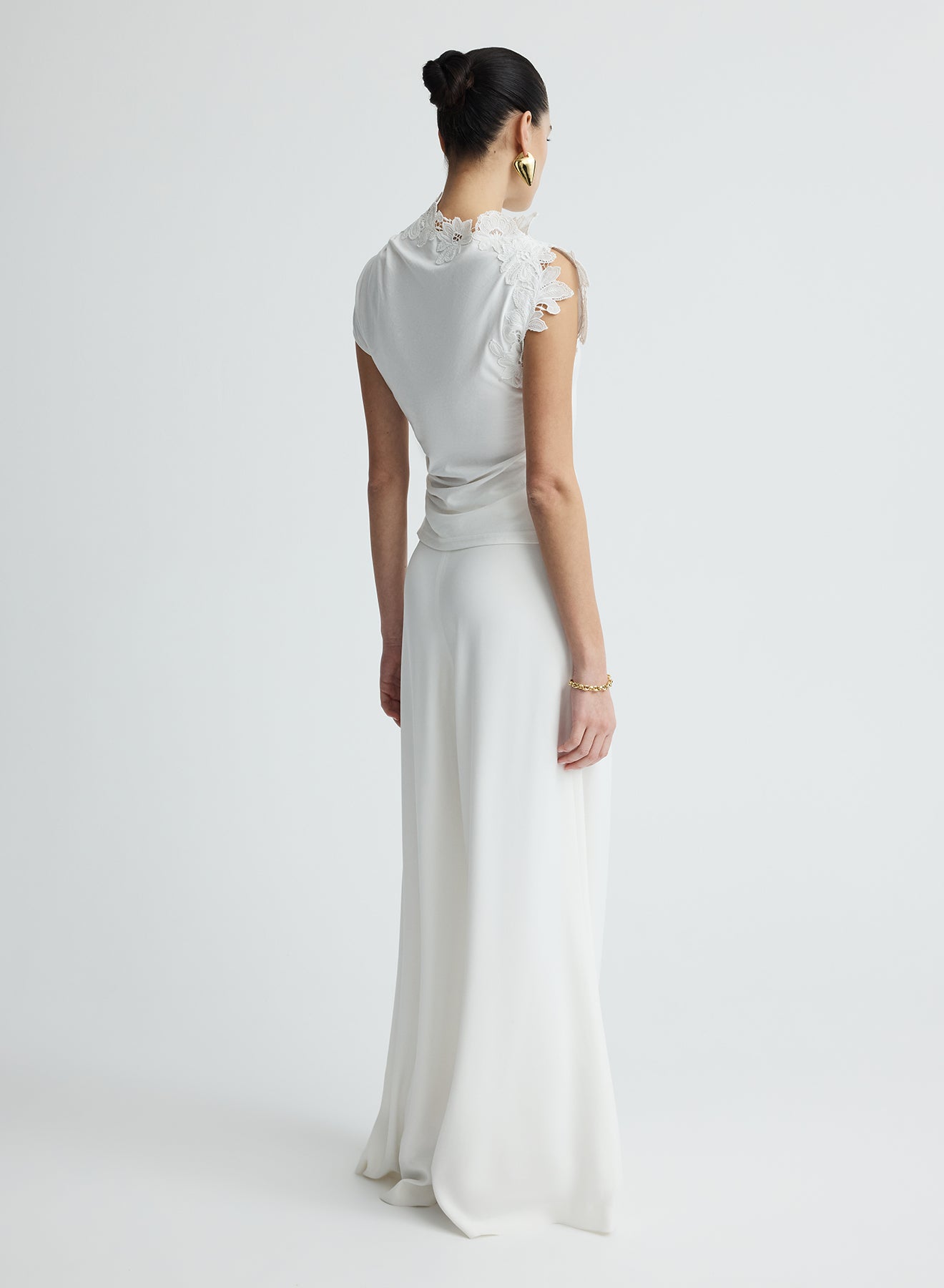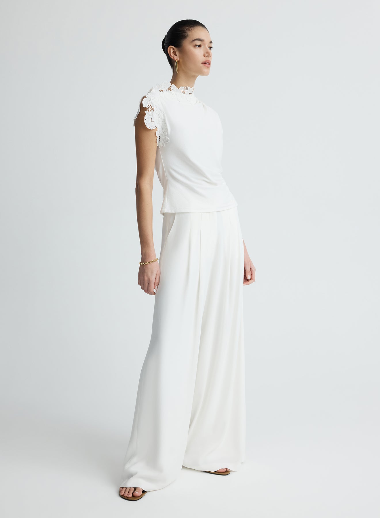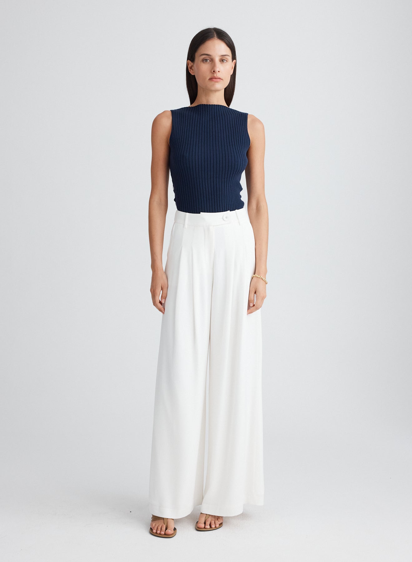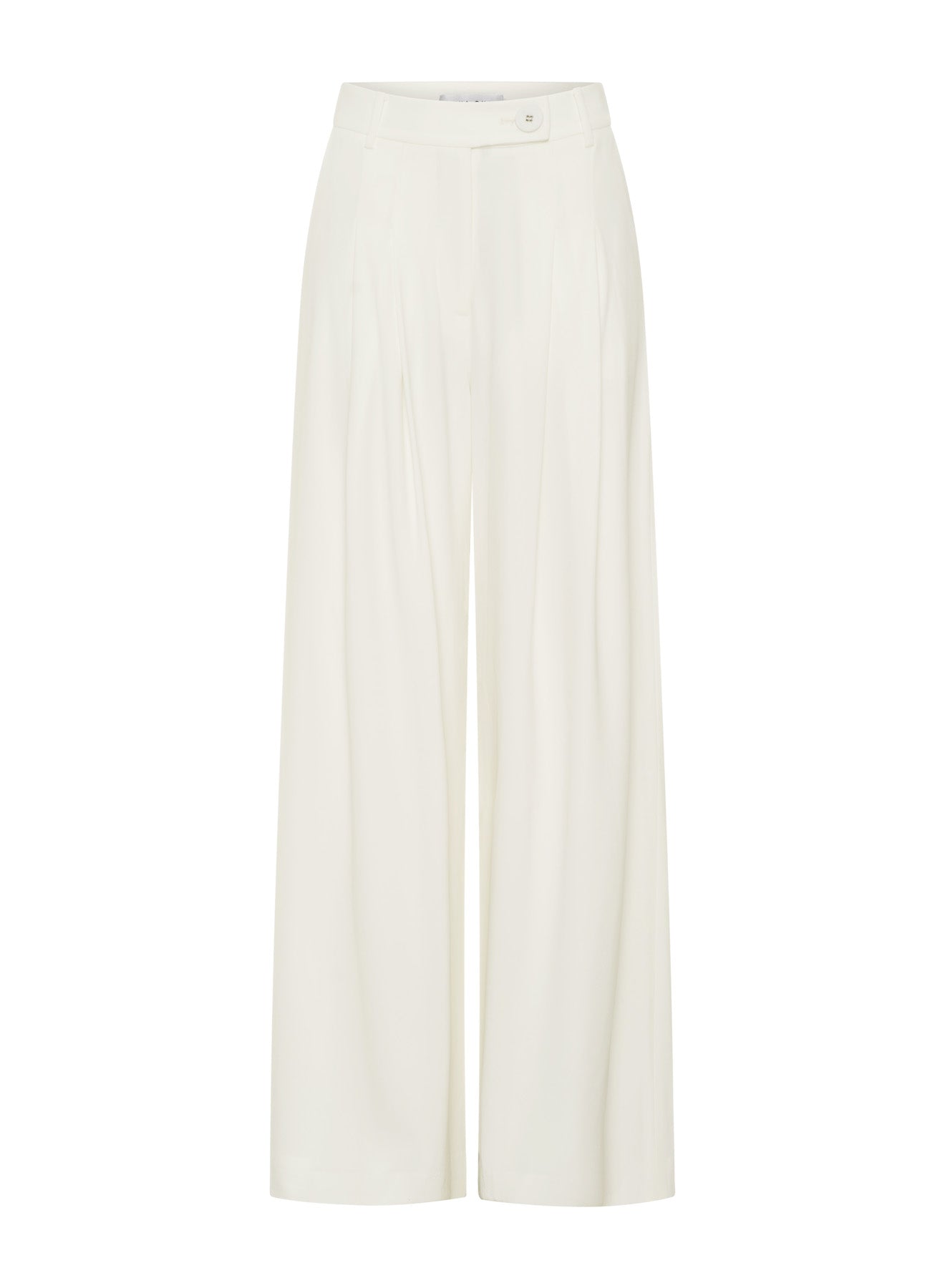 The Mateo Pants in Snow are wide-leg pants crafted in satin back crepe. Designed with pressed pleats, side pockets and a high waistband.